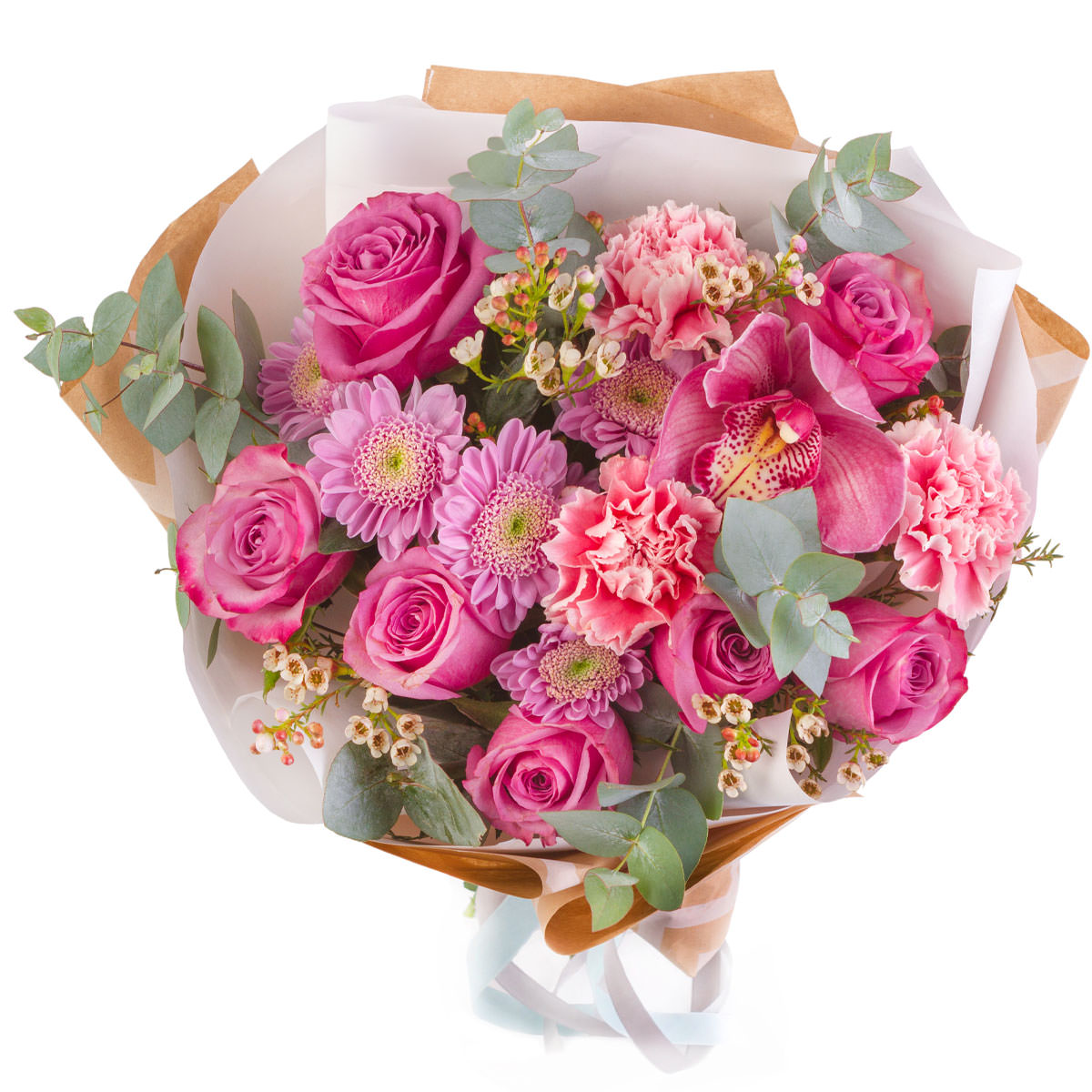 Роза одноголовая розовая, орхидея розовая, хризантема кустовая сиреневая, ваксфлауэр, эвкалипт. Упаковка (лента, пленка, крафт, сетка, пленка матовая)