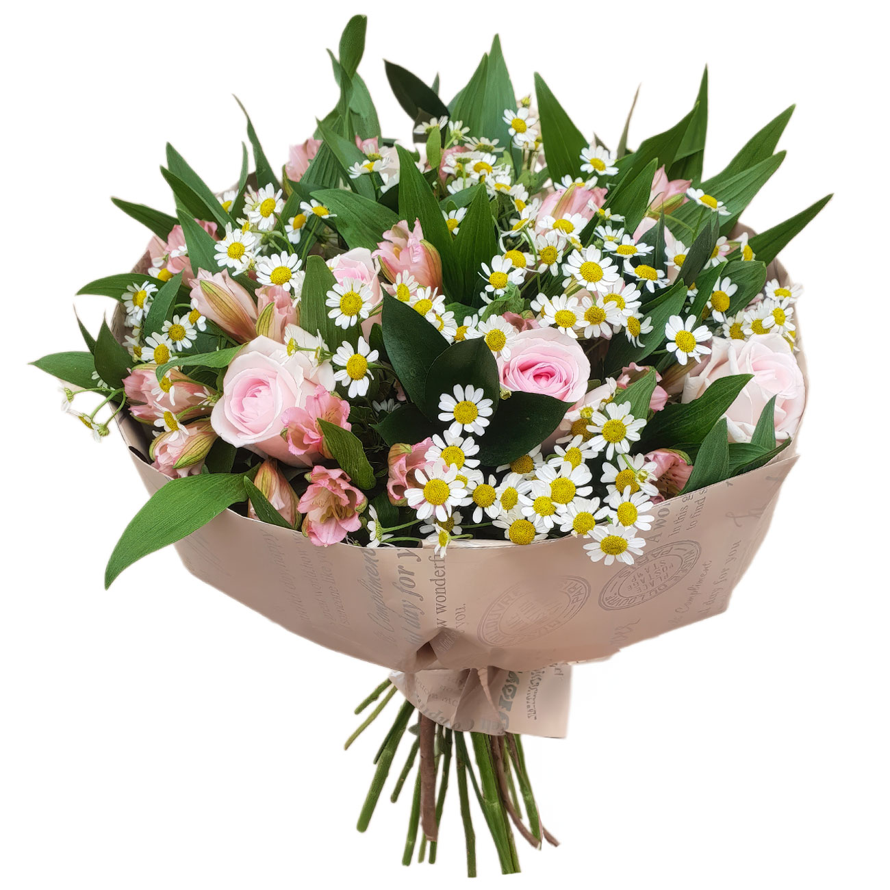 Танацетум, альстромерия розовая, роза одноголовая розовая, зелень. Упаковка (лента, пленка, крафт, сетка, пленка матовая)