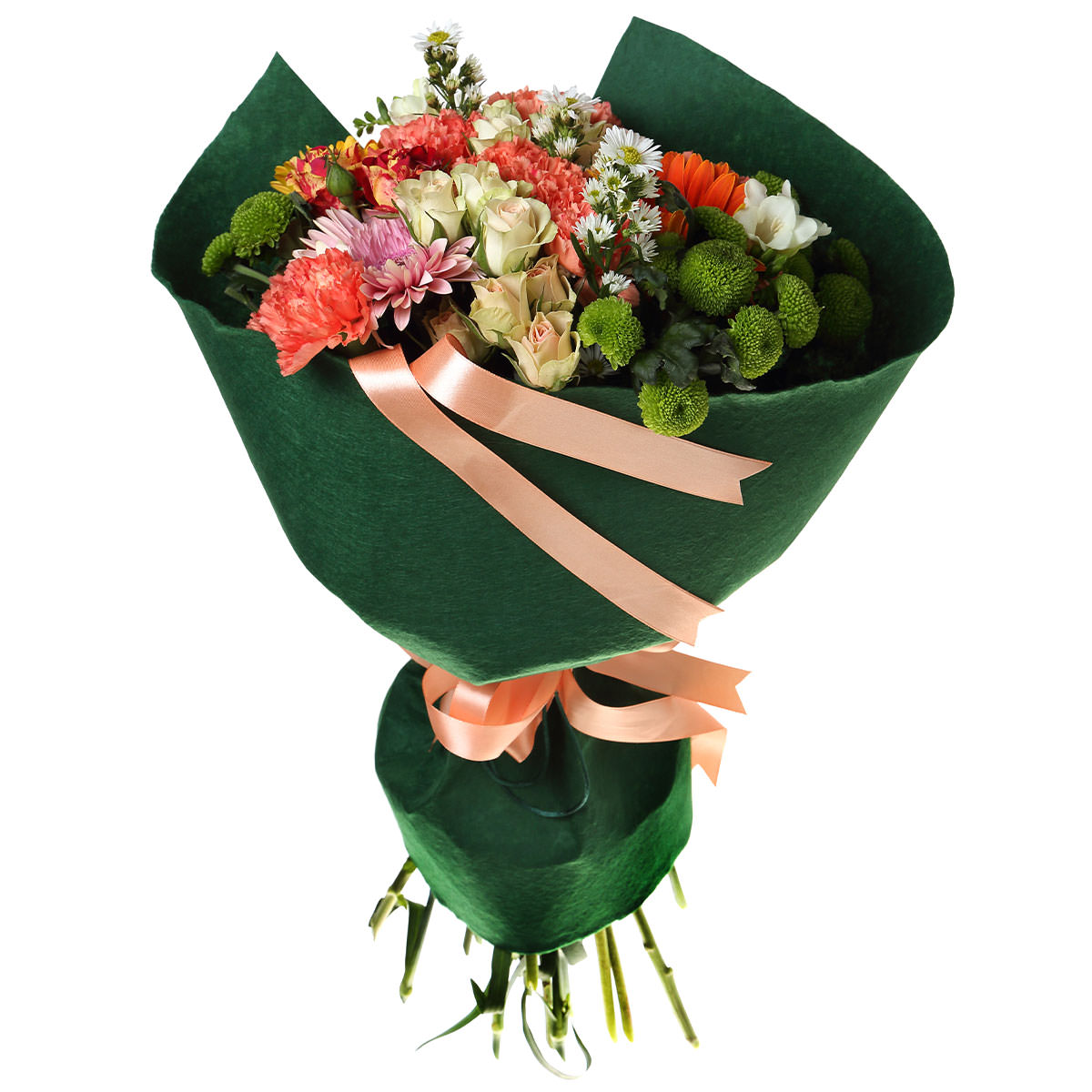 Роза кустовая кремовая, хризантема одноголовая оранжевая, гербера оранжевая, хризантема кустовая зеленая, фрезия белая, ромашка. Упаковка (лента, пленка, крафт, сетка, пленка матовая)