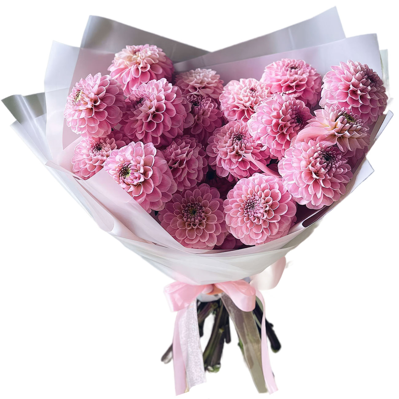 Георгина розовая. Упаковка (лента, пленка, крафт, сетка, пленка матовая)