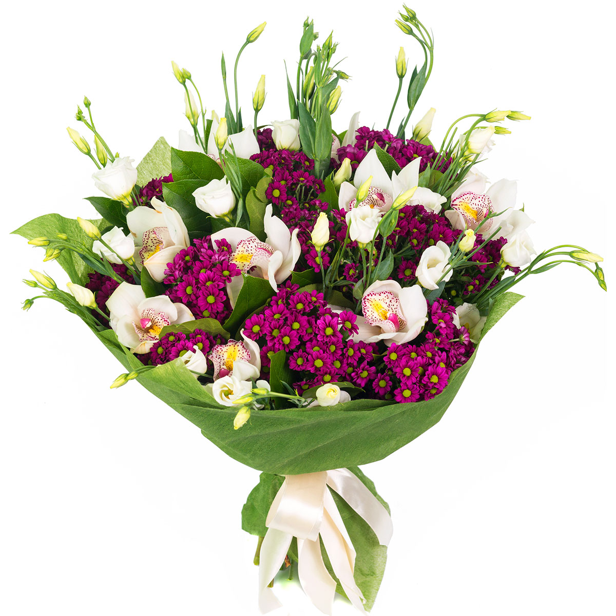 Орхидея белая, примула сиреневая, эустома белая. Упаковка (лента, пленка, крафт, сетка, пленка матовая)
